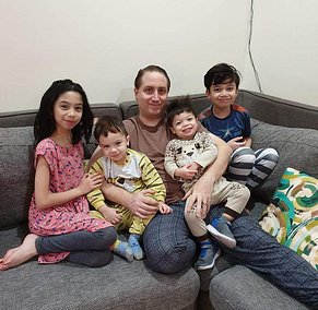 My four kids and I after waking up bright and early during a Kuwait Holiday in February 2019.